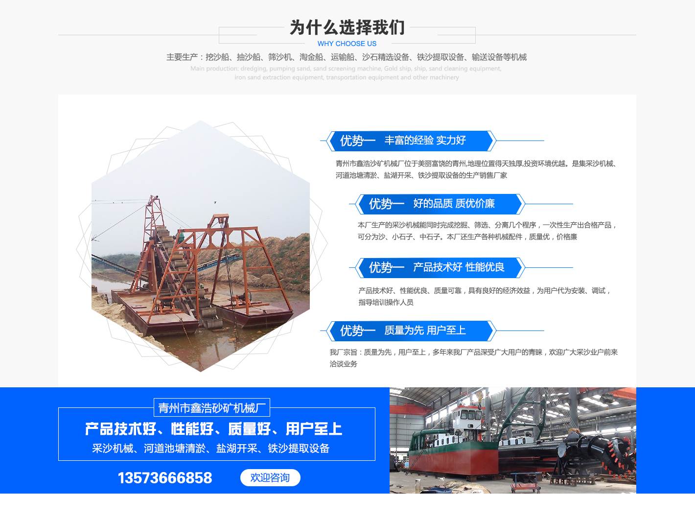 公司主要生产:挖沙船、抽沙船、筛沙机、淘金船、运输船、沙石设备、铁沙提取设备、输送设备等机械,共有七大系列二十多个品种,供用户选择,并根据用户地理环境设计制作异型产品,本厂生产的采沙机械能同时完成挖掘、筛选、分离几个程序,生产合格产品,可分为沙、小石子、中石子。效益高,成本低。本厂还生产机械配件,质量优良,价格廉。